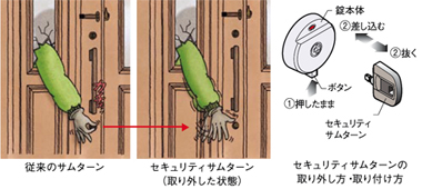 ボタンを押すだけでサムターンの取り外しが可能。外出時や就寝時に外しておけば、ガラスを割られて手を入れられてもサムターンがないので開けられる心配がない。