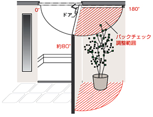 強風時や急な操作時に扉が開くことで起きるはさみ込みなどの事故を防ぐため、ブレーキ機能を持ったバックチェック機構付ドアクローザを装備。入隅納まりの時の外壁や照明器具などにドアがぶつかって傷つくことも防ぐ。