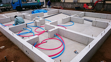 基礎工事は、御覧の通り・・・美しい仕上がりで完成!『さや管ヘッダー方式』による給水工事も万全です!