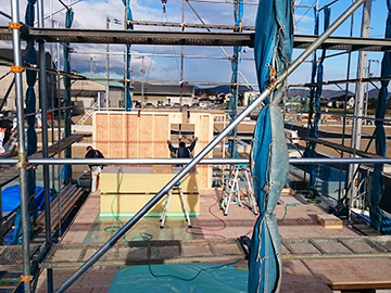 12月22日(火)には『1F吊り込み工事』を実施!クレーンで吊り込まれたパネルを、大工さんが慎重に所定の位置へセット!